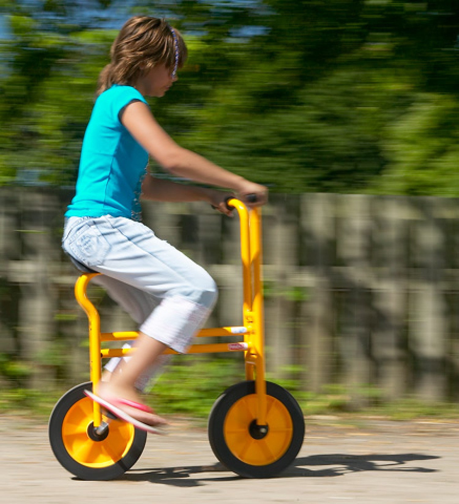 Det spesielle designet med pedaler på bakhjulet gir barna masse moro og glede, samtidig som sykkelens kompleksitet utfordrer denne aldersgruppen.