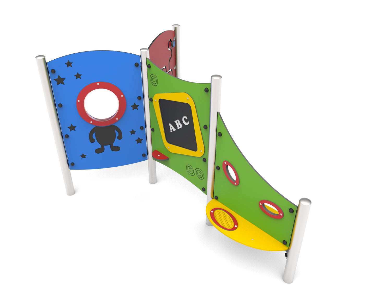 En morsom sammensetning av forskjellige skillevegger, som du lett kan plassere på lekeplassen for å lage forskjellig lekesoner. I denne gruppen er det fire vegger, en med ett spill, en med en tavle, og en vegg hvor barna kan leke astronauter samt en vegg med en benk.