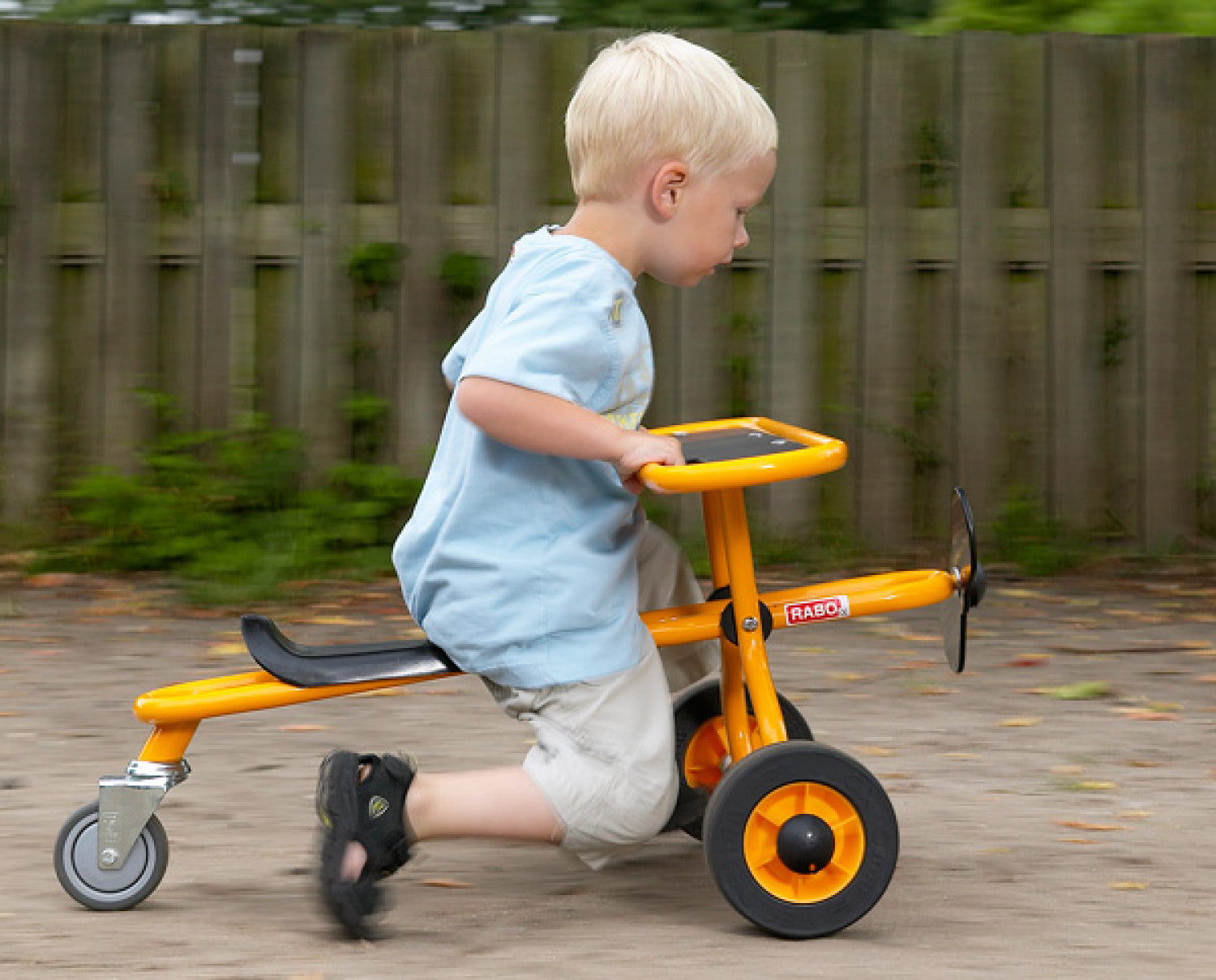 Det svingbare hjulet bak oppmuntrer barnet til å oppdage sammenhengen mellom ønsket om å gå i en bestemt retning og behovet for å bruke hele kroppen for å komme dit.