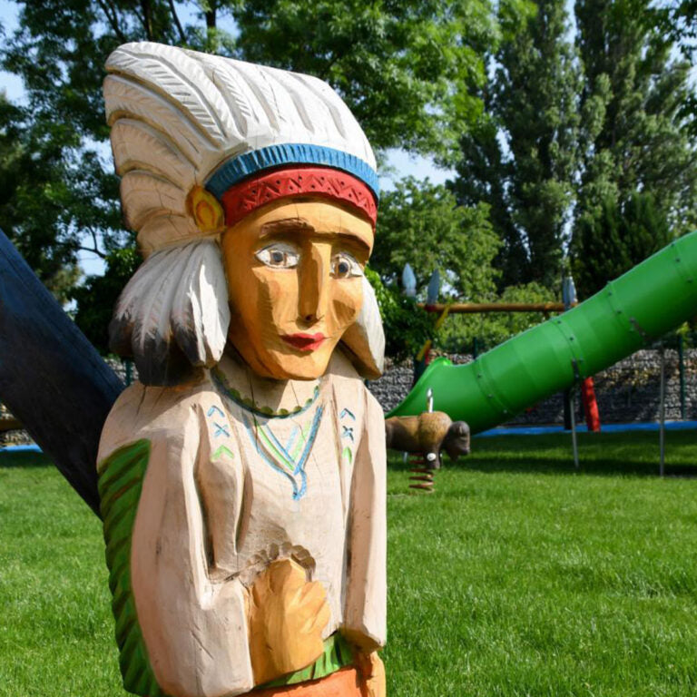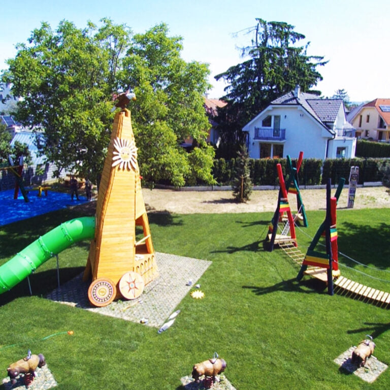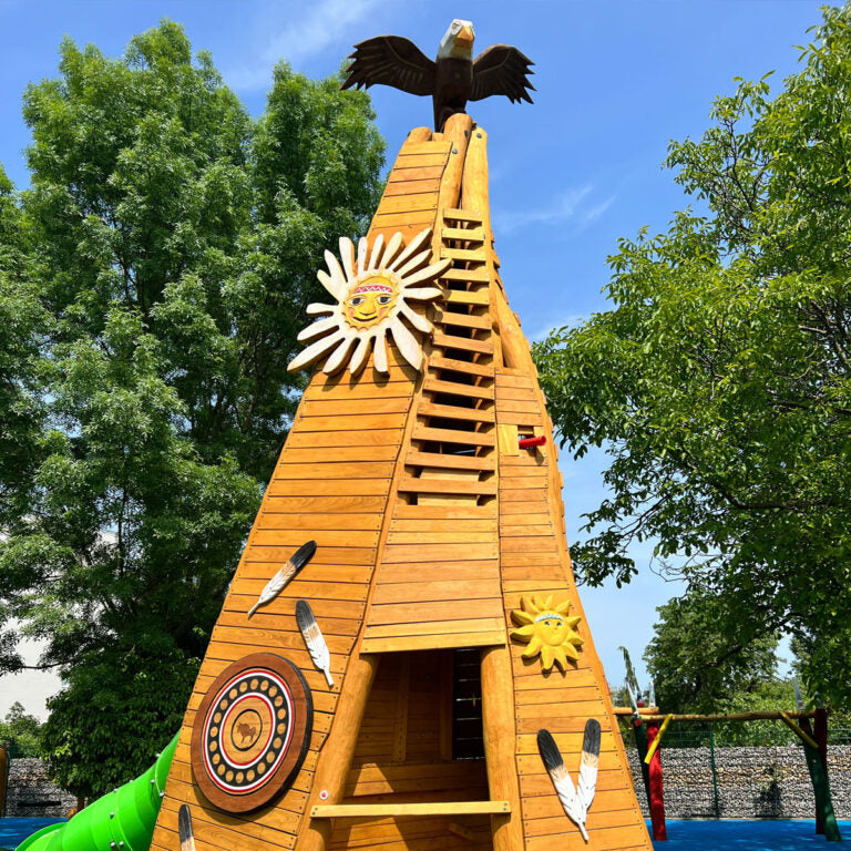 Den indianske lekeplassen er et av våre mest kunstneriske og stemningsfulle prosjekter. Vi ble inspirert av kulturen til urbefolkningen i Nord-Amerika, som levde i nær tilknytning til naturen, dyrene og den åndelige verden. Ambisjonen vår var å overføre denne filosofien til et rom for barn – å skape et miljø der de kan lære å respektere naturen, oppdage historier og samtidig leke og bevege seg fritt.