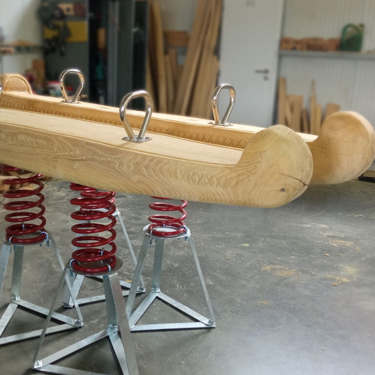 Hvert element på lekeplassen ble spesialdesignet av våre designere og laget i samarbeid med erfarne snekkere og snekkere. Ornamentene er basert på indiansk symbolikk – du kan finne sol-, ørn-, ulve- eller dyrespor i dem. Vi brukte håndskårne teknikker under produksjonen, noe som gir hver detalj originalitet og karakter. Lekeplassen er ikke bare et sted å leke, men også et kunstverk på utsiden.