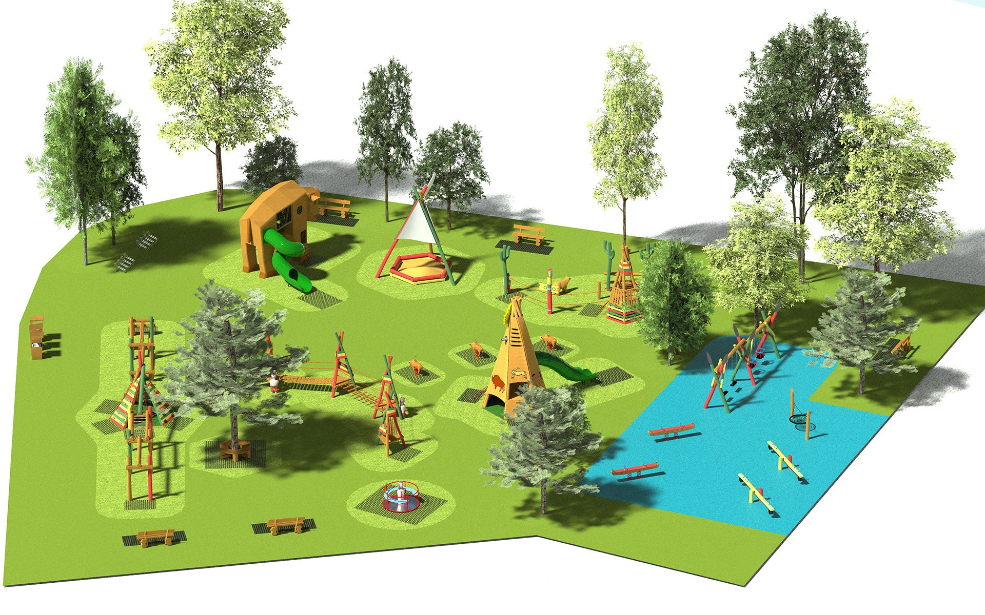 I tillegg til bisonen inneholder lekeplassen også et totemtårn med utkikkstårn, hengebroer, klatrevegger, balansebroer, klatrenett og andre spillmoduler. Alt er tematisk integrert i den indianske historien og skaper et komplekst miljø for bevegelse, eventyr og fantasifull lek.