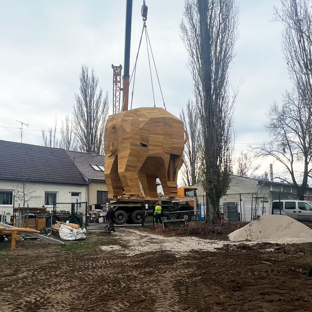 Det dominerende trekk ved hele lekeplassen er en imponerende bison i tre, som er et fullt funksjonelt lekeelement . Inni er det en tunnel å klatre gjennom, og bakerst er det en sklie i rustfritt stål som fører barna trygt tilbake til bakken.