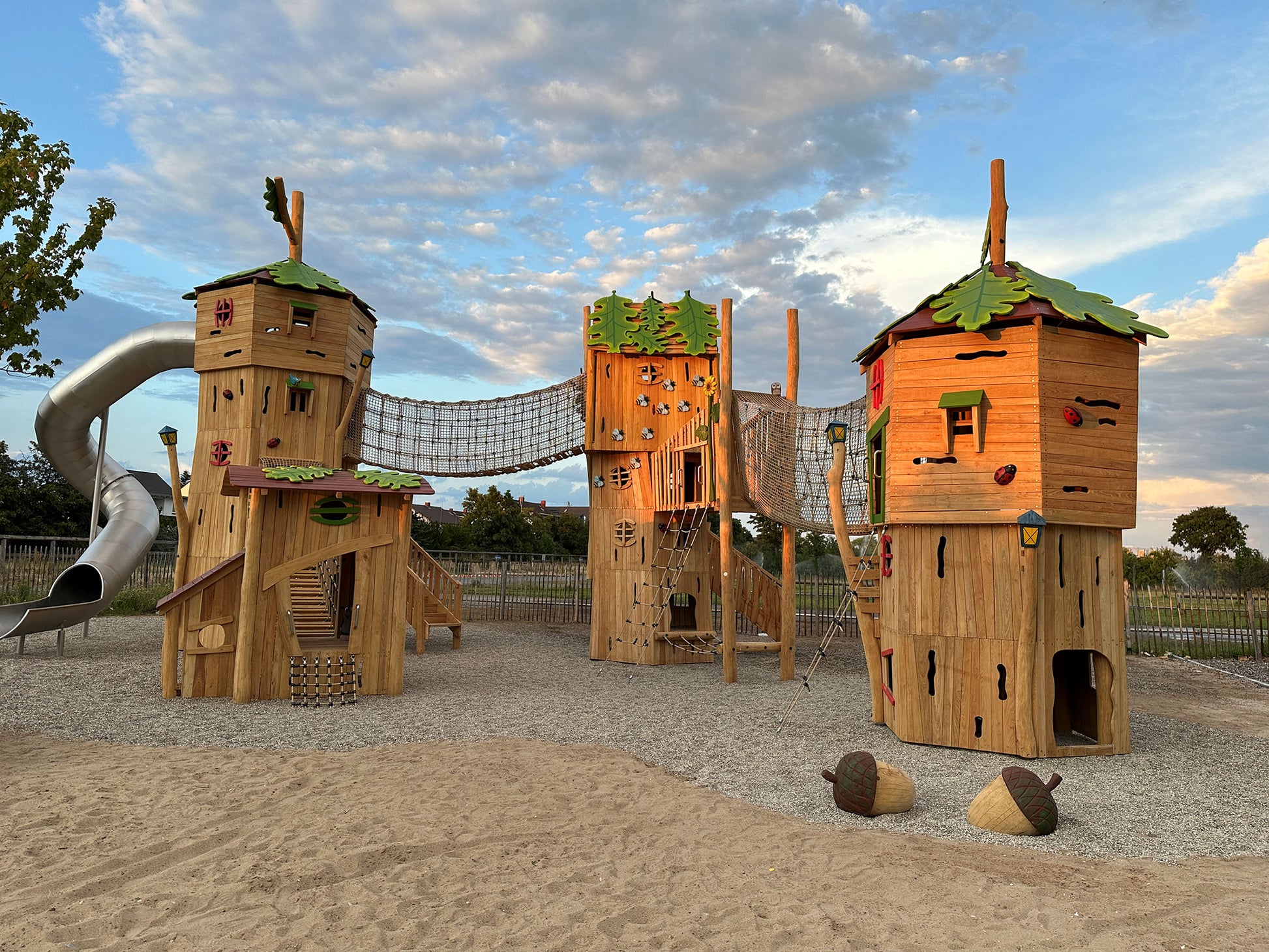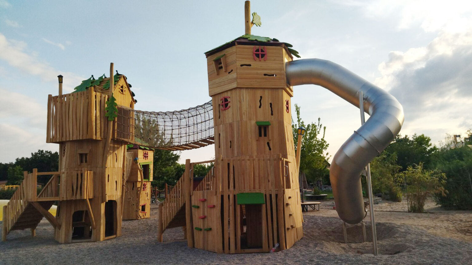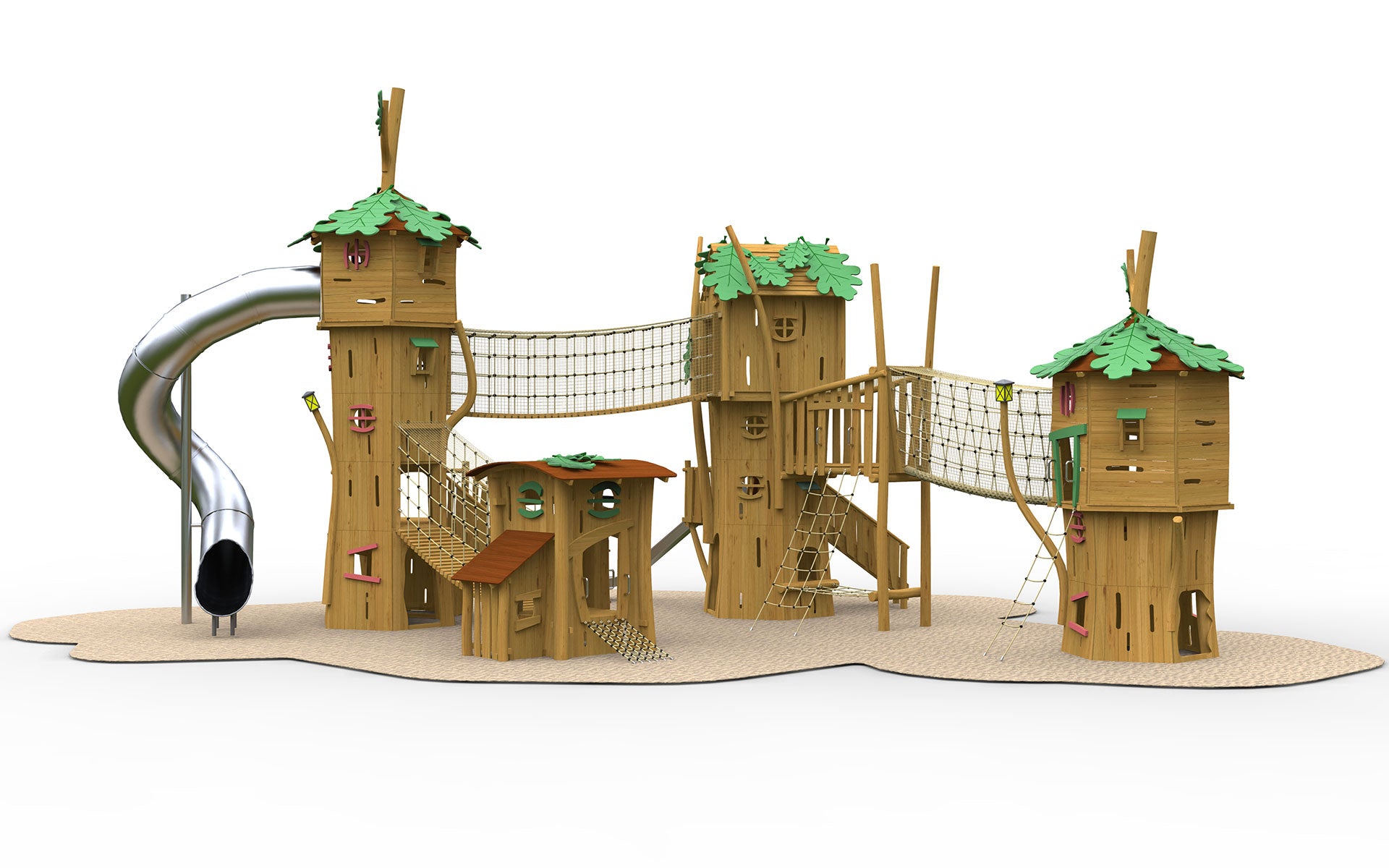 Lekeplassen er forbundet med hengebroer, klatrevegger og vannsklier. Takket være de ulike høydene og vanskelighetsgradene tilbyr lekeplassen eventyr for både yngre og eldre barn. Alle elementene er utformet med meningsfull bevegelse, aktiv oppdagelse og vekking av barns fantasi i tankene.