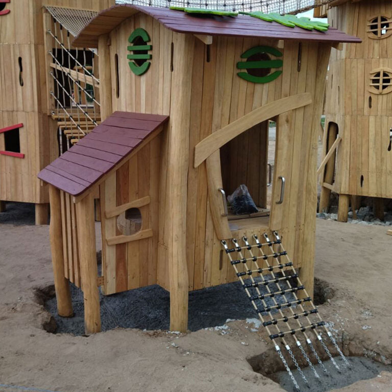 Hver detalj er håndlaget – fra de uregelmessige linjene på veggene til de takbelagte takshinglene og de utskårne skodder. Trekonstruksjonene er laget med håndverkspresisjon og kunstnerisk innsats, slik at lekeplassen ikke bare fungerer som et lekesenter, men også visuelt fullfører det offentlige rommet i en naturlig ånd.