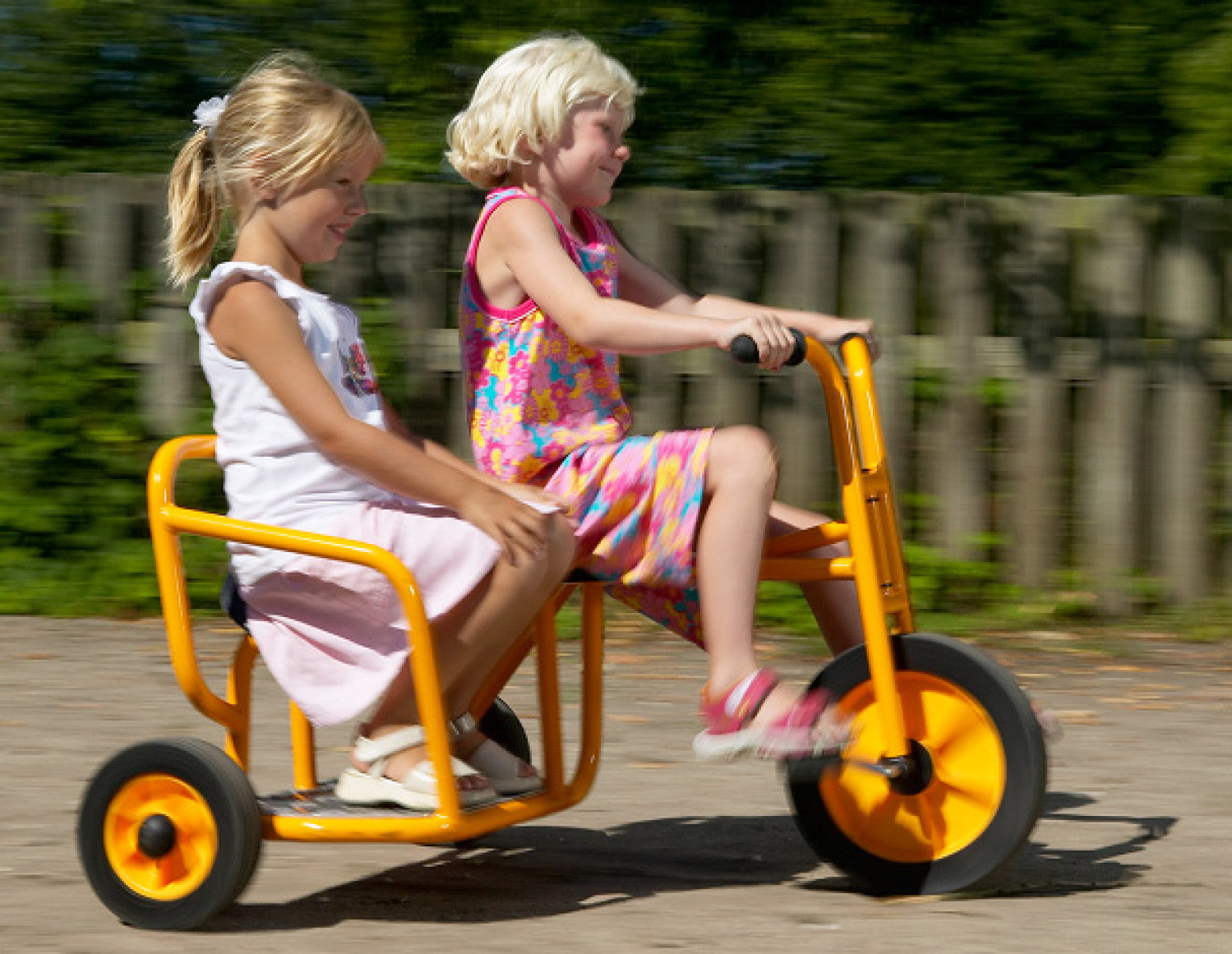 Sidevognsykkelen har stort potensial for sosial lek, siden to barn kan bruke den samtidig. Den bygger også bro i barnas utvikling – fra parallelllek til sosialt interaktiv lek – ved at det yngste barnet kan sitte ved siden av en eldre venn som «styrer».
