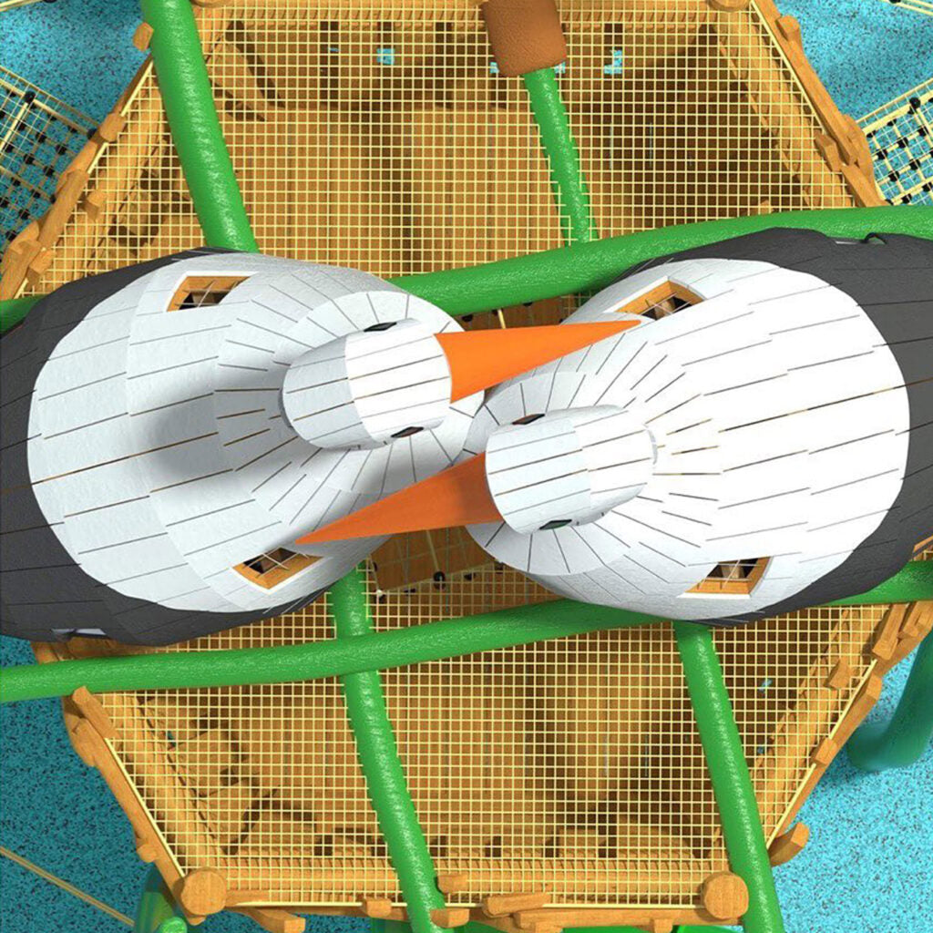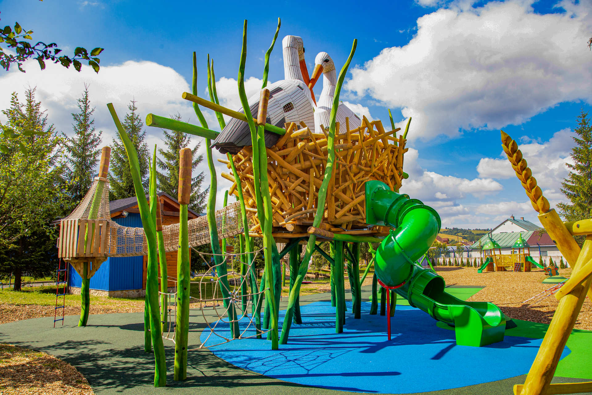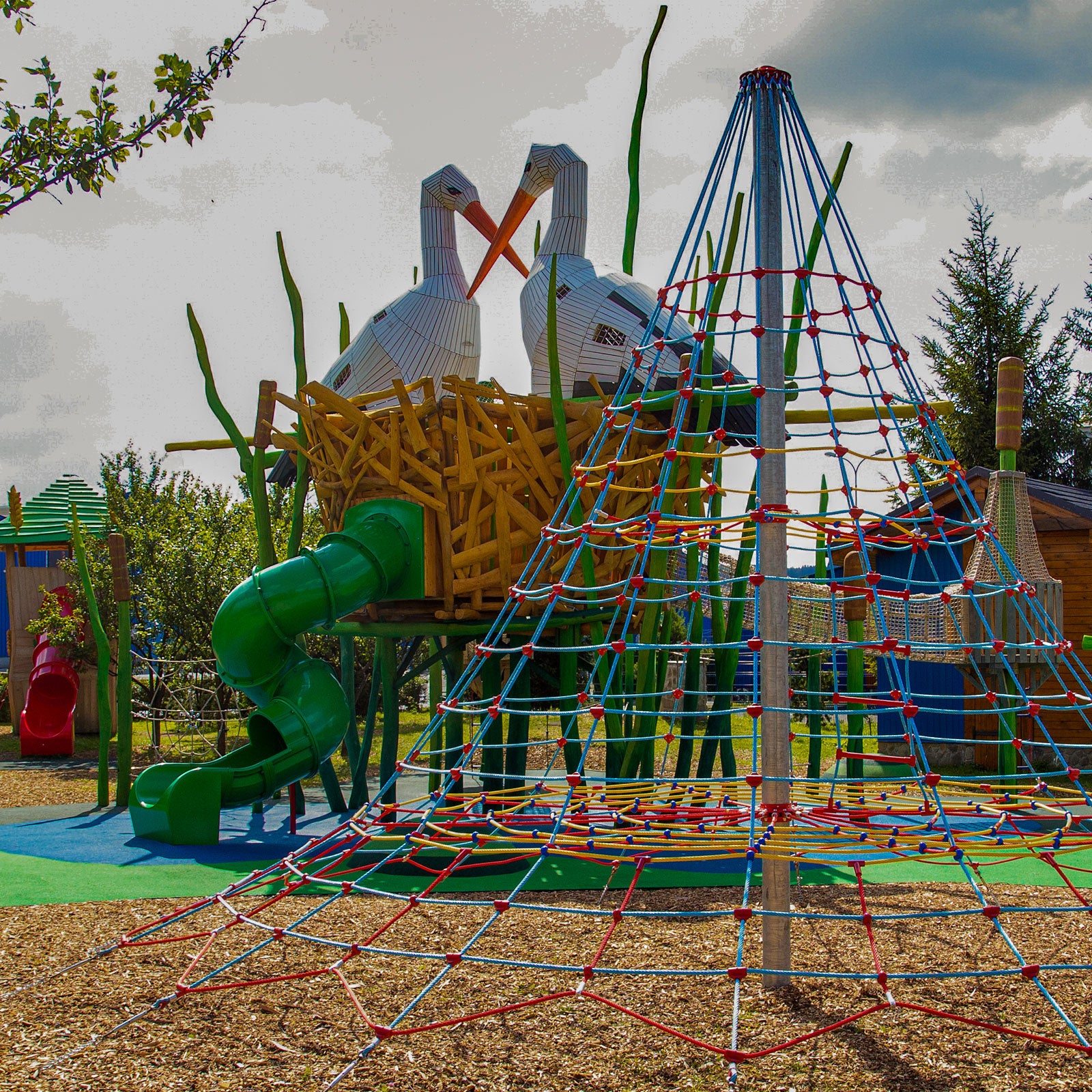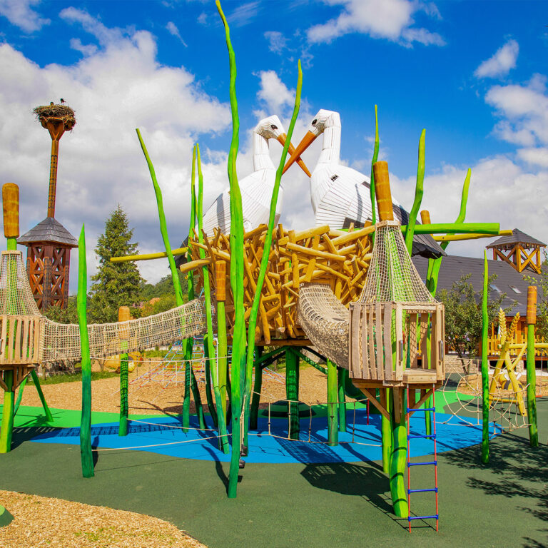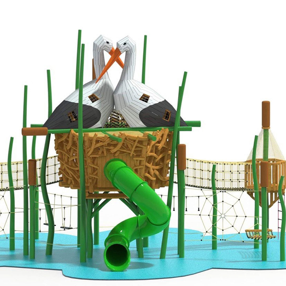 Hjertet i hele lekeplassen er en hevet lekestruktur formet som et storkereir, som kan nås via klatrenett, hengebroer og tunneler. Innsiden av redet skjuler seg nettingområder for avslapning, ly, utkikksposter og innganger til sklier. Alt er designet for å stimulere nysgjerrighet og gi barn muligheter til å bevege seg, leke og slappe av.
