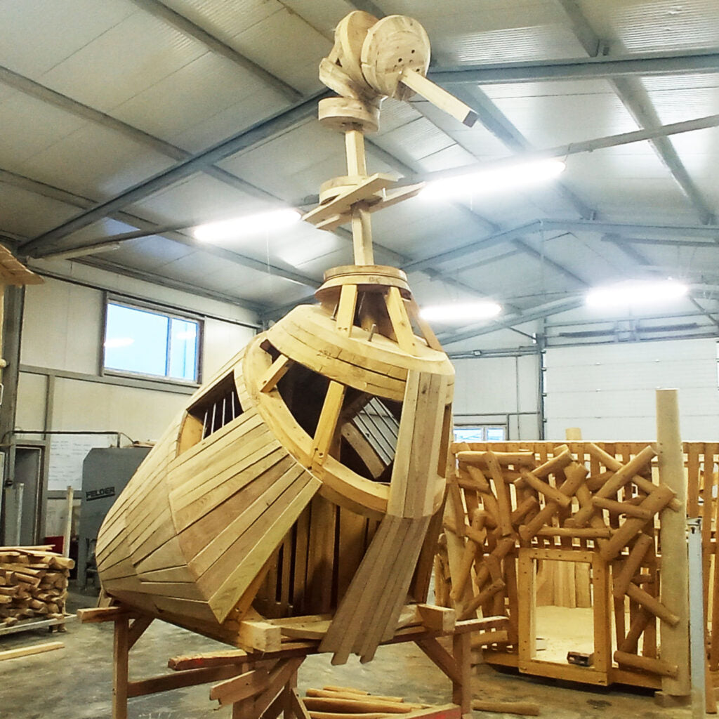 De gigantiske storkene er ikke bare et visuelt blikkfang, men fungerer også som lekeelementer i tårn med stiger og sklier. Kroppene deres er håndformet av massivt tre med vekt på detaljer, proporsjoner og håndverk.